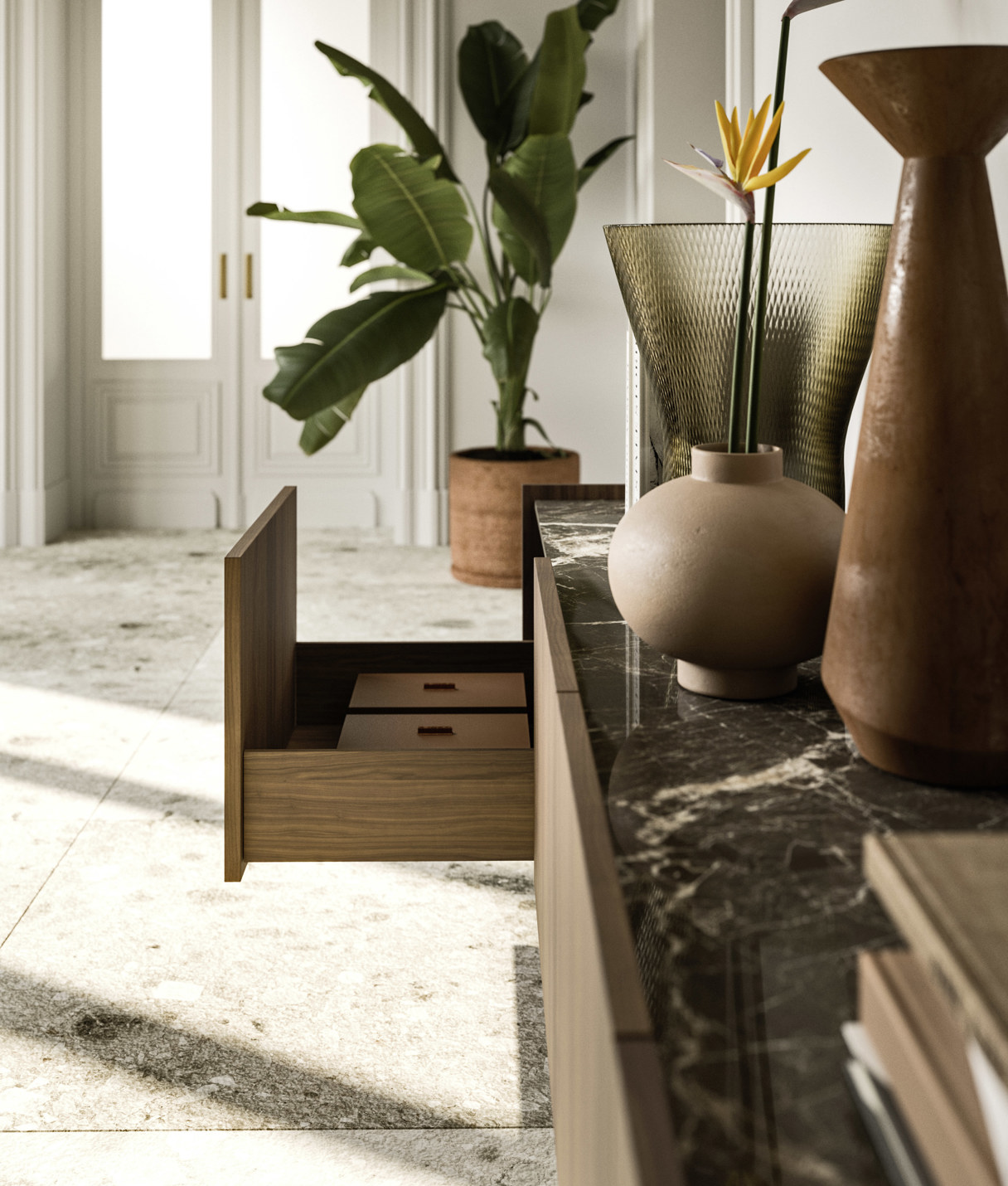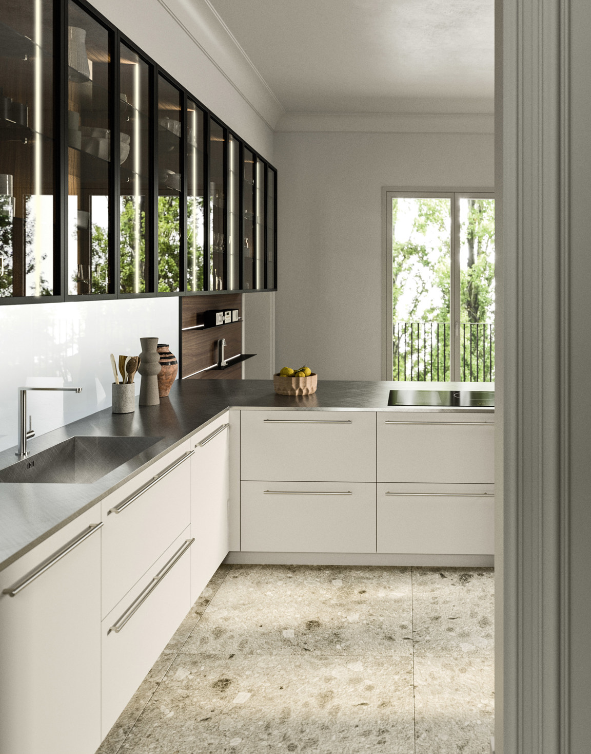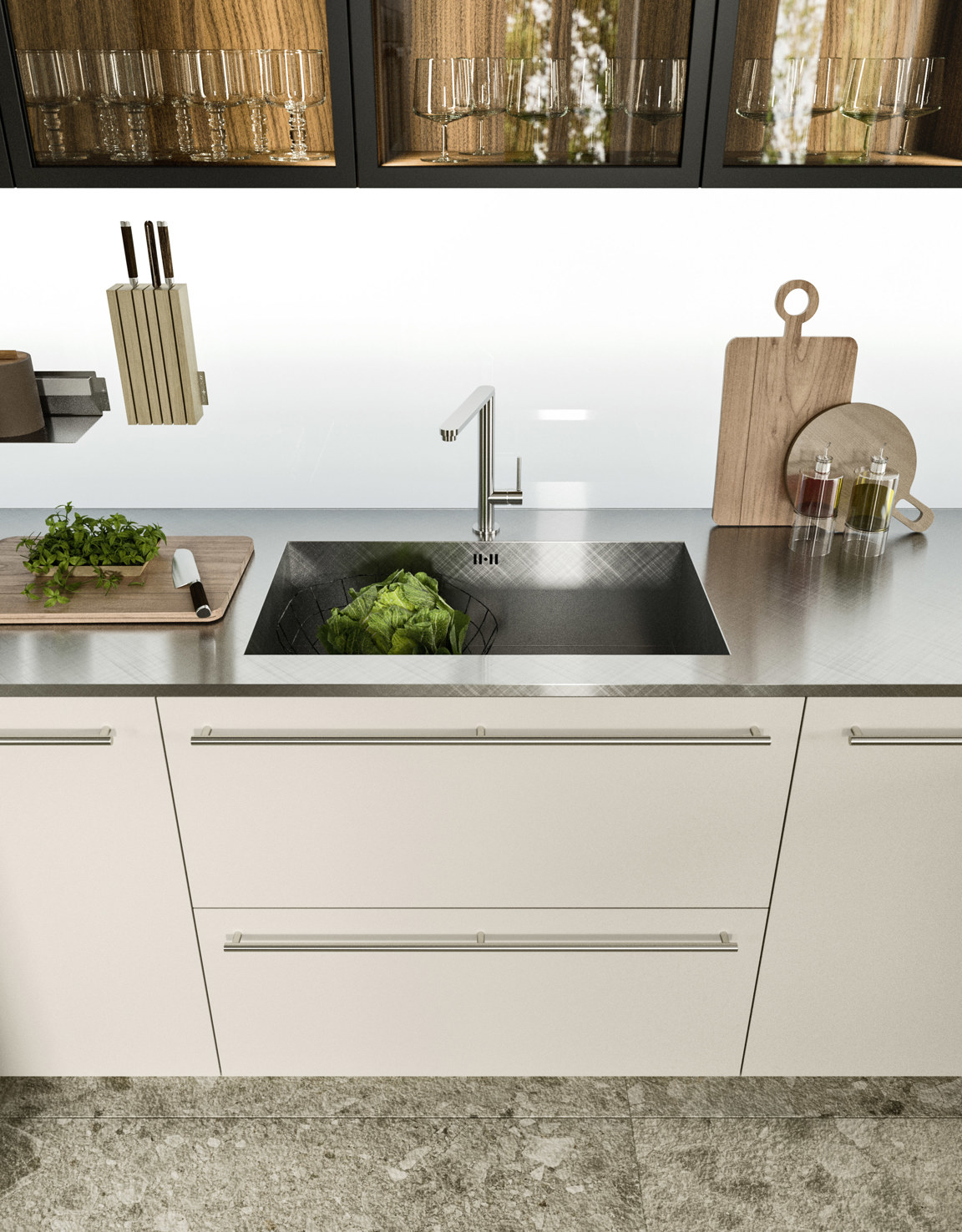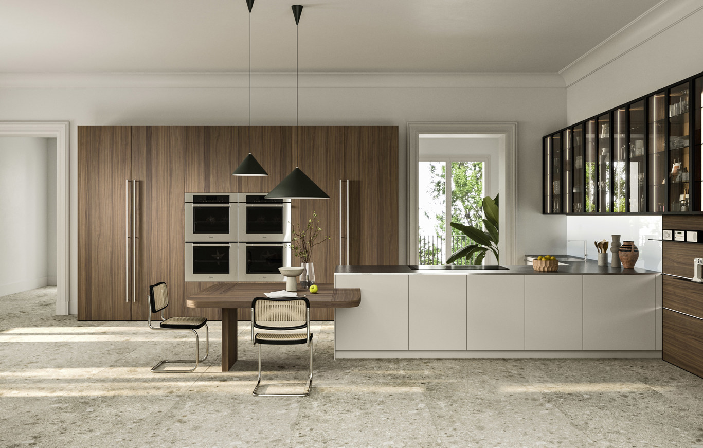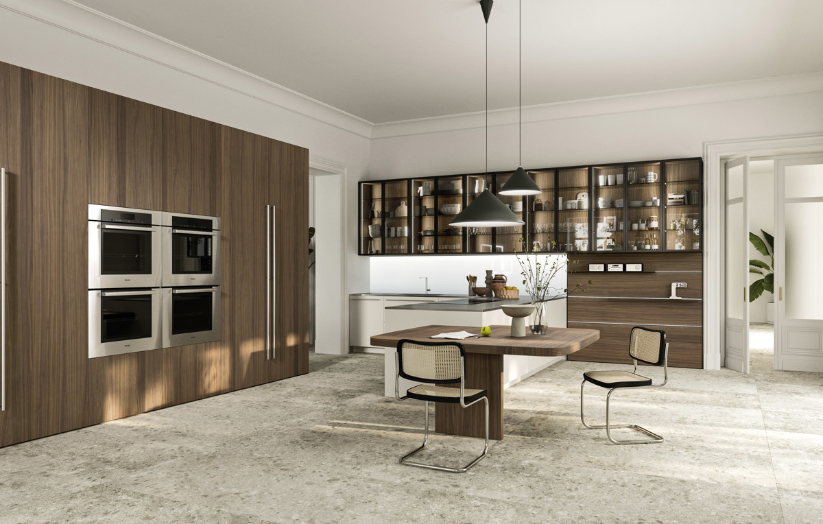 Khu bếp được thiết kế rộng rãi và trang bị hoàn hảo, nổi bật với các bề mặt màu xám Tremiti Grey và gỗ óc chó Mỹ veneer. Các tủ trưng bày Rialto nhẹ nhàng và tinh tế cho phép nhìn thấy đồ bên trong đồng thời tăng cường ánh sáng tự nhiên cho căn phòng.